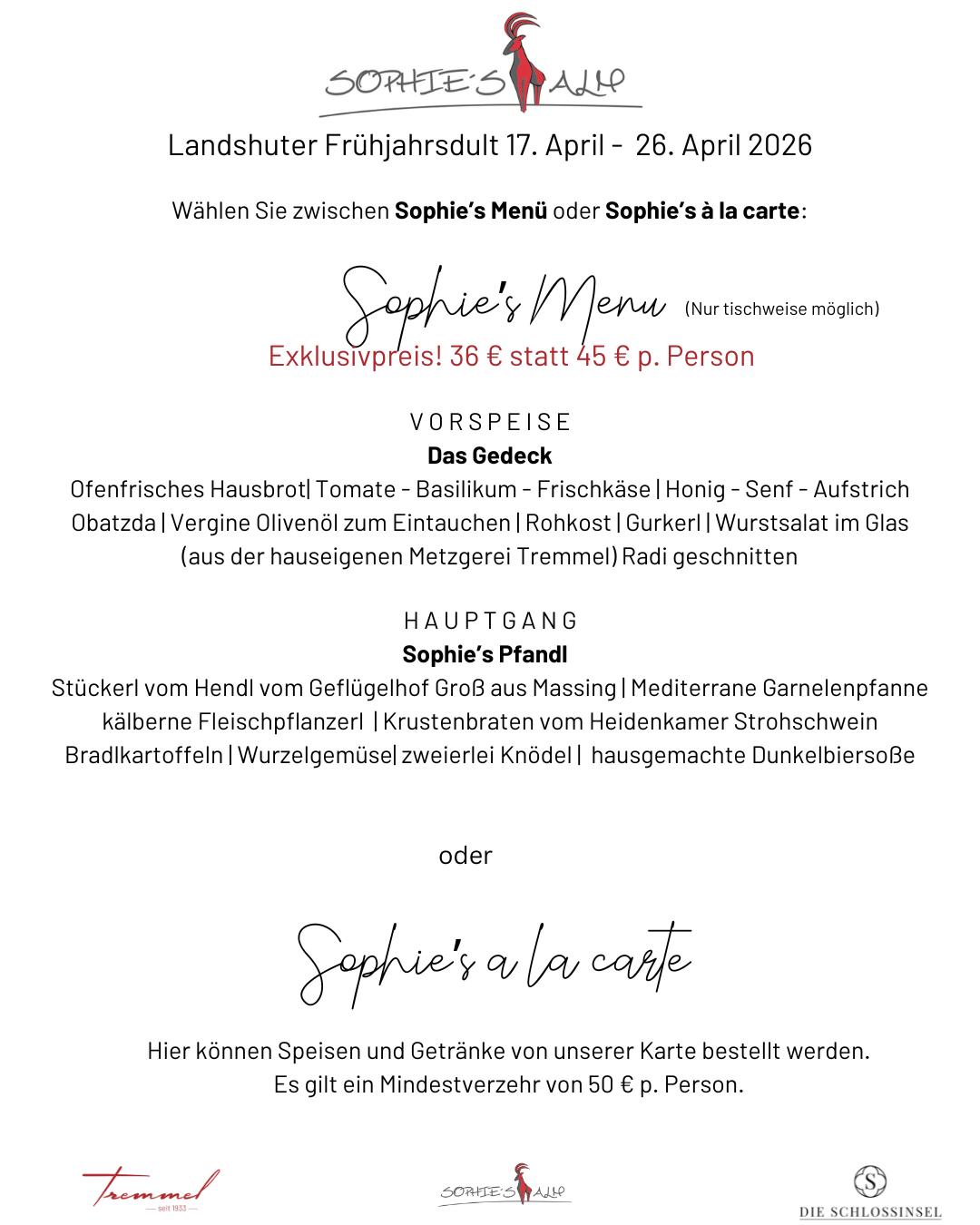 Mit feinsten Schmankerl aus der hauseigenen Metzgerei Tremmel und bekannten Wiesn - Bands sorgt Festwirt Alexander Tremmel für eine unvergessliche Zeit auf der Landshuter Frühjahrsdult in der legendären Sophie‘s Alm.